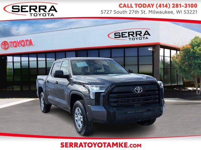 TREAT YOURSELF TO THIS 2024 TOYOTA TUNDRA SR CREWMAX 4WD!! THIS VEHICLE WILL NOT LAST!!! Dominate the road and the job site with this rugged Magnetic Gray Metallic 2024 Toyota Tundra SR. Featuring a spacious CrewMax cabin and a versatile 5.5-foot bed, this CARFAX One-Owner truck is a MUST SEE for anyone seeking modern power and Toyotas legendary reliability. Turbocharged V6 Power The 2024 Tundra has traded the old V8 for a more efficient and powerful twin-turbocharged engine: i-FORCE 3.4L Twin-Turbo V6: Delivers a robust 348 horsepower and 406 lb-ft of torque, providing massive low-end grunt for towing and hauling. 10-Speed Automatic Transmission: Offers smooth, intelligent shifting with uphill/downhill shift logic to optimize power delivery. Capable 4x4 System: Features an Electronic Transfer Case (Part-Time 4WD), allowing you to switch between 2WD and 4WD easily as Milwaukee weather changes. High-Strength Bed: Built with an ultra-durable Sheet-Molded Composite (SMC) surface that resists dents, dings, and rust. The CrewMax Cabin Experience The SR trim focuses on "Robust Simplicity," providing a practical and comfortable interior: CrewMax Versatility: Offers massive rear legroom, comfortably seating five adults with a 60/40 split-folding rear seat that reveals hidden under-seat storage. Modern Connectivity: Comes standard with an 8-inch Toyota Audio Multimedia touchscreen featuring Wireless Apple CarPlay and Android Auto. Practical Comfort: Includes Automatic Air Conditioning, durable Black Fabric seating, and a Power Rear Window for easy access to the bed and improved airflow. Toyota Safety Sense 2.5 Every 2024 Tundra is loaded with advanced driver-assist technology to keep you and your cargo safe: Pre-Collision System w/Pedestrian Detection: Monitors the road ahead and can automatically apply the brakes if it senses a potential collision. Full-Speed Range Dynamic Radar Cruise Control: Maintains a preset distance from the vehicle ahead, even in stop-and-go highway traffic. Lane Tracing Assist: Uses the lines on the road to help keep the truck centered in its lane. Automatic High Beams: Toggles between high and low beams based on surrounding traffic for better nighttime visibility. Why Shop Serra Toyota of Milwaukee? Located at 5727 South 27th St, we are proud to serve the Milwaukee and surrounding areas for over 40 years! This 2024 Tundra SR is a powerhouse of a truck. Toyota Financing available!! Frequently Asked Questions (FAQ) Q: Where can I see the full inventory? A: Visit SERRATOYOTAMKE.COM for our complete, up-to-the-minute listings and detailed vehicle history reports. Q: What is the towing capacity of the SR trim? A: When properly equipped, the Tundra SR with the i-FORCE V6 has a maximum towing capacity of up to 8,300 lbs. Q: Does it have a spare tire? A: Yes! This Tundra includes a Full-Size Spare Tire stored securely under the body with a crank-down mechanism. Q: How do I schedule a test drive? A: Call us today at 414-281-3100 or stop by our showroom on South 27th St! ACT FASTA CLEAN, ONE-OWNER 2024 TUNDRA CREWMAX 4X4 IS THE PERFECT TRUCK FOR WISCONSIN WINTERS! |